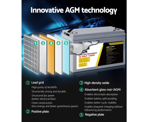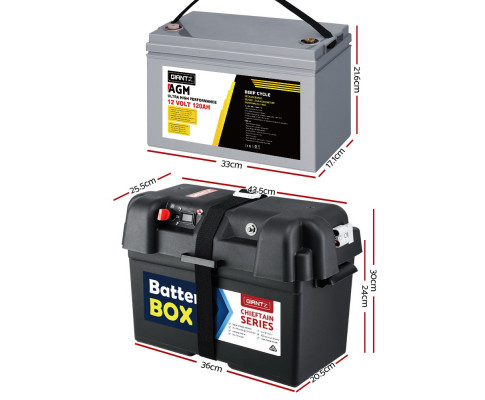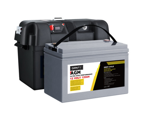 Battery Box and Battery a powerful battery to a formidable power station. That is what our GIANTZ Deep Cycle Battery and Battery Box combo can do. On its own, the 120Ah 12V battery features an incredible cycle life of up to 1400 cycles. What you get is a longer, consistent and more drawn out charge all the time. And with its advanced AGM technology, the battery enables better electrolyte absorption, cyclic stability and frequent charging without affecting performance.