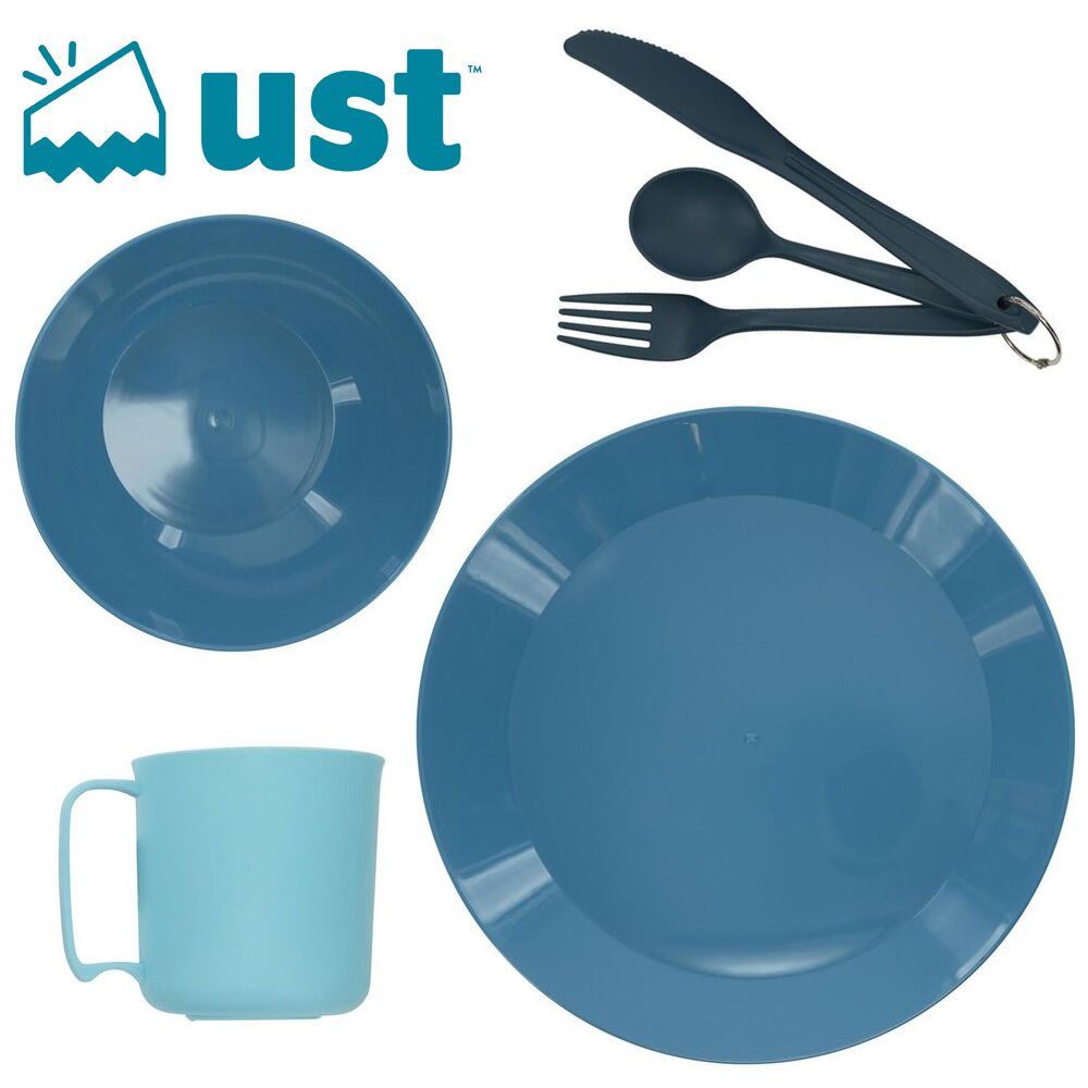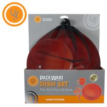 Dish Set with Utensils, The UST Pack Ware Dish Set is all one needs when hiking, backpacking or camping. This dining kit includes a plate, bowl, cup, fork, knife and spoon, and has a hang sleeve to transport it in comfortably. Lightweight and durable construction, this dish set for one is what you are looking for.