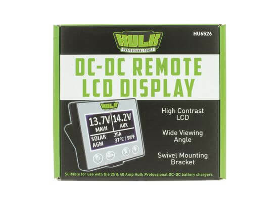 HULK Remote LCD Hulk Professional Remote LCD Display Monitor comes with a 3.5 metre Cable. Suitable for use with the 25 amp and 40 amp Hulk Professional Series DC – DC Battery chargers. It also provides the precise status of your battery system and charger. The user can select from three default screens that display critical information on the status of the auxiliary battery. The output current, the output voltage and the input voltage. Also the back light intensity can be dimmed during night viewing or increased during the day. The LCD display can be fixed on any flat surface with screws or adhesive tape or use the swivel arm.