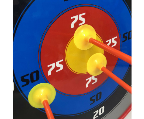 90cm tall standing target, 1 bow, 3 arrows, 1 dart shooter, 6 darts and a quiver carry case.