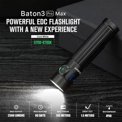 Olight  Baton 3 Pro Max is new compact rechargeable long-range LED torch. The Baton Pro Max delivers a maximum output of 2500 lumens.