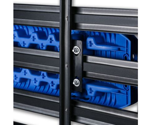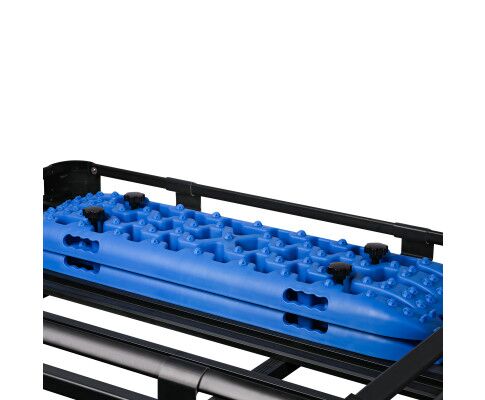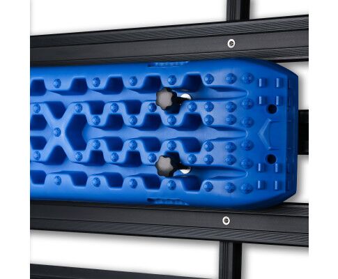 Place the nuts and recovery tracks on the roof rack,and then fix the black plastic plate and tighten the nuts